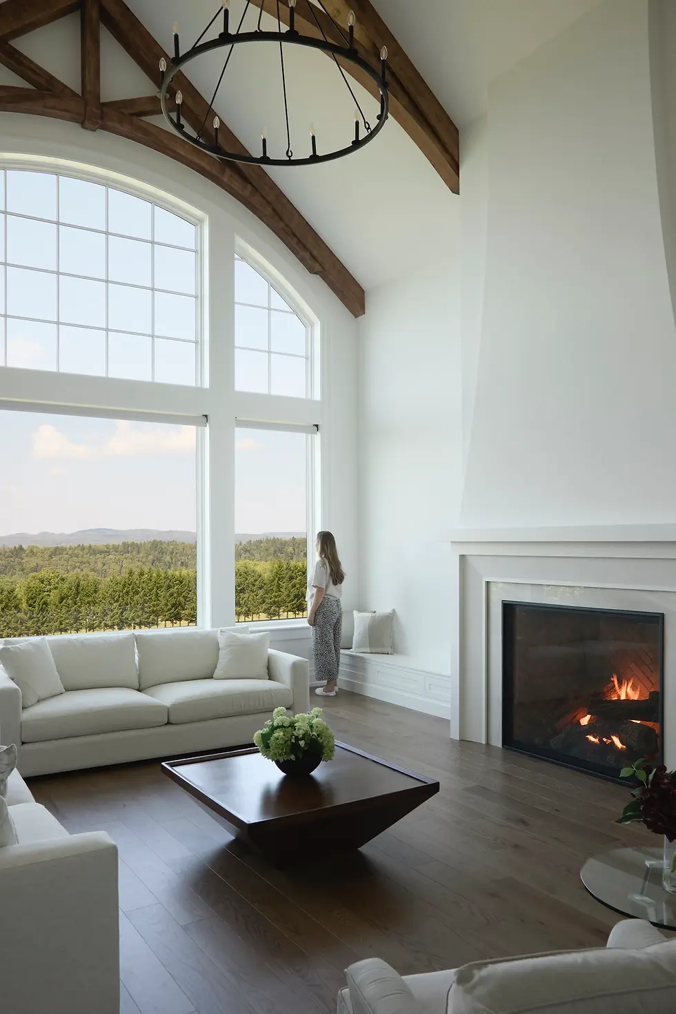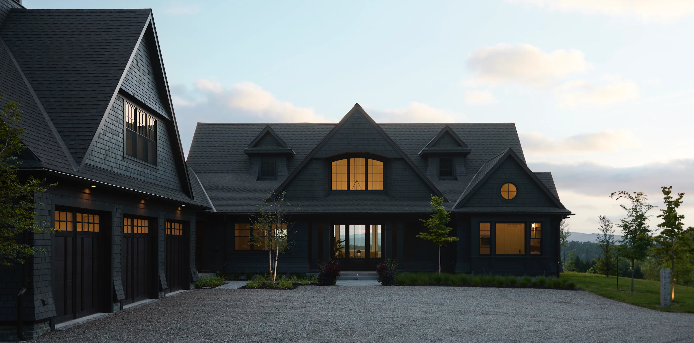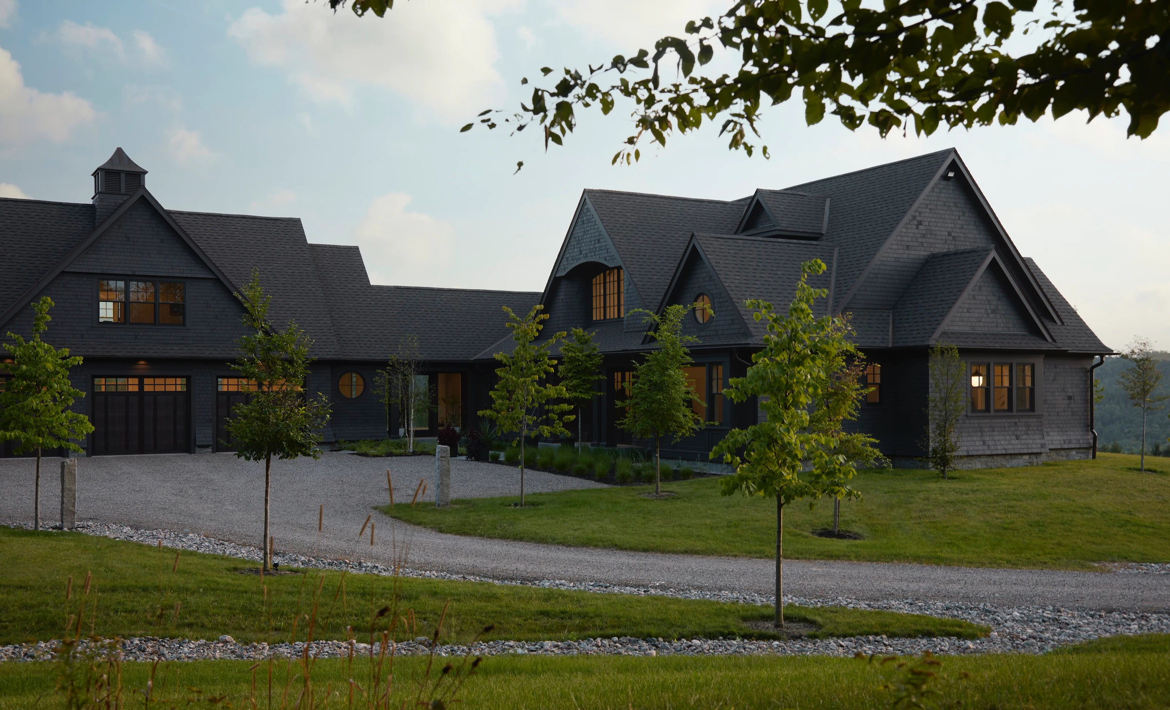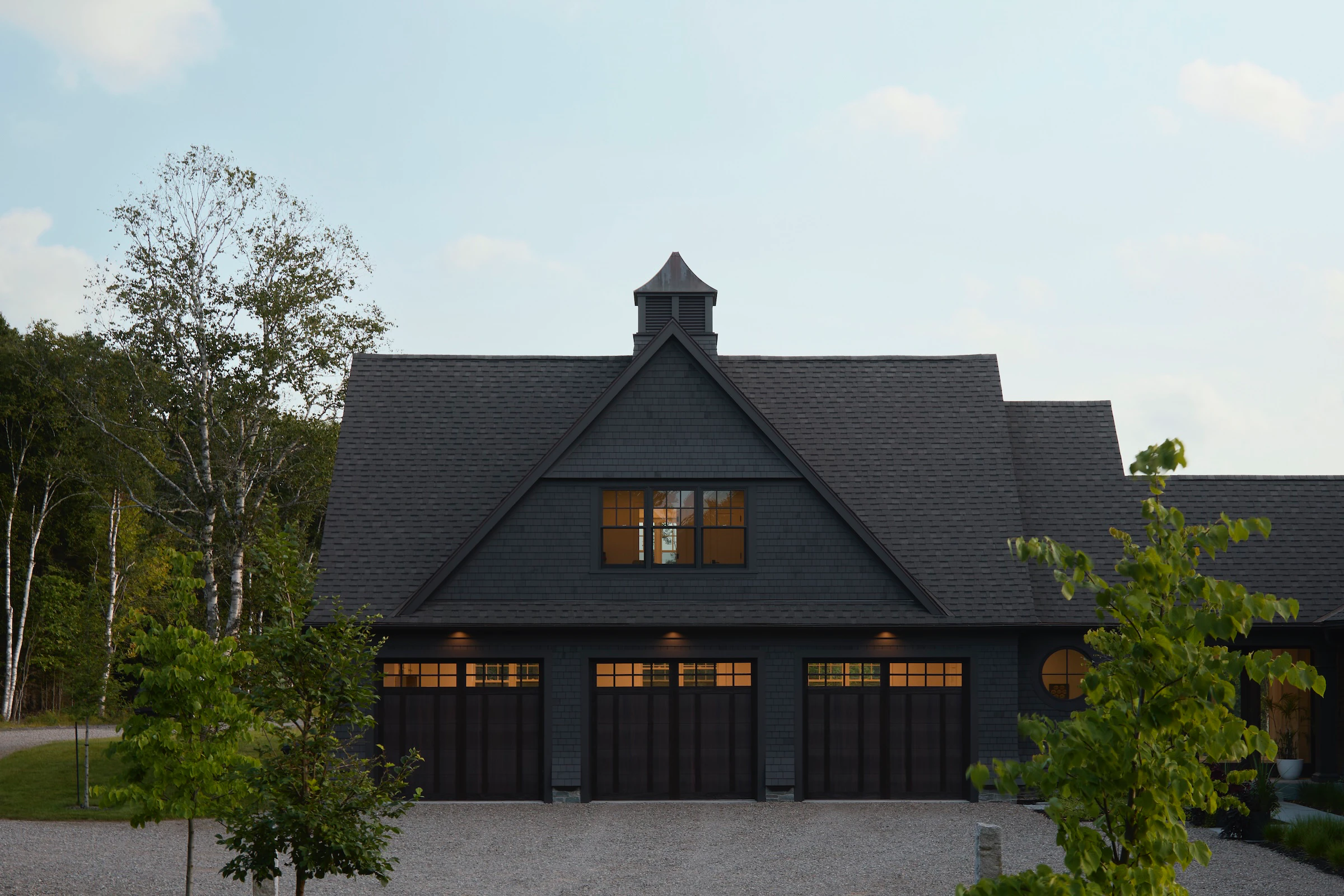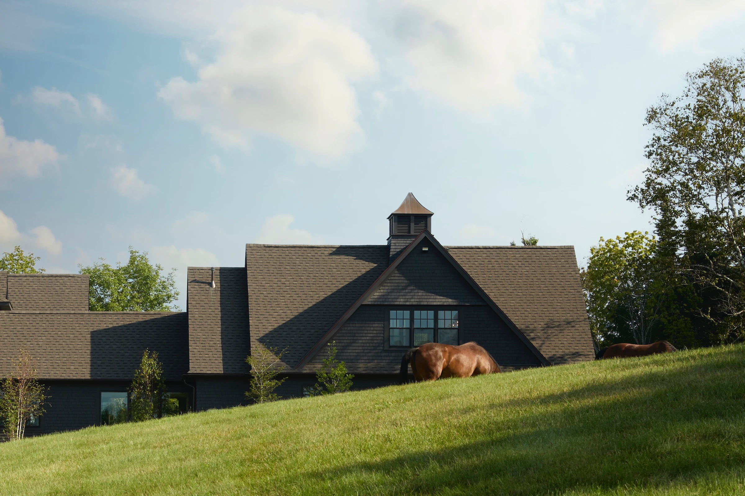 La façade sombre est particulièrement saisissante ici. Sur le fond vert des champs et des arbres, elle confère à la maison une allure audacieuse qui ne passe pas inaperçue. À l'intérieur, les fenêtres baignent l'espace de lumière et créent une atmosphère accueillante, permettant de profiter de la vue depuis presque n'importe quelle pièce.