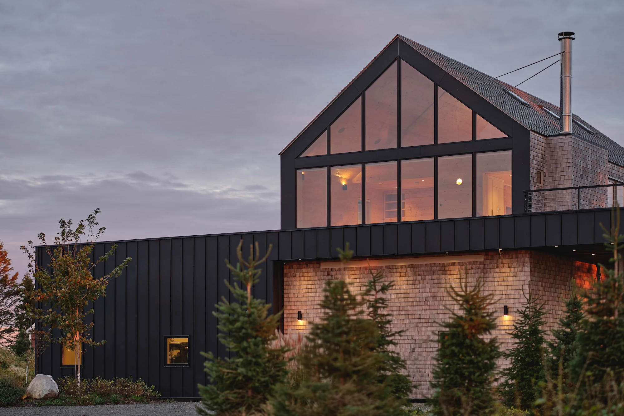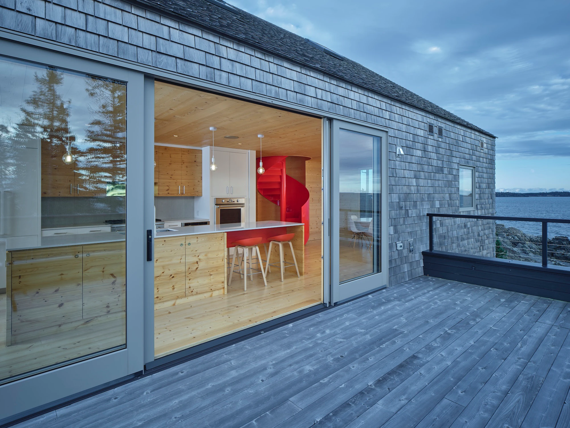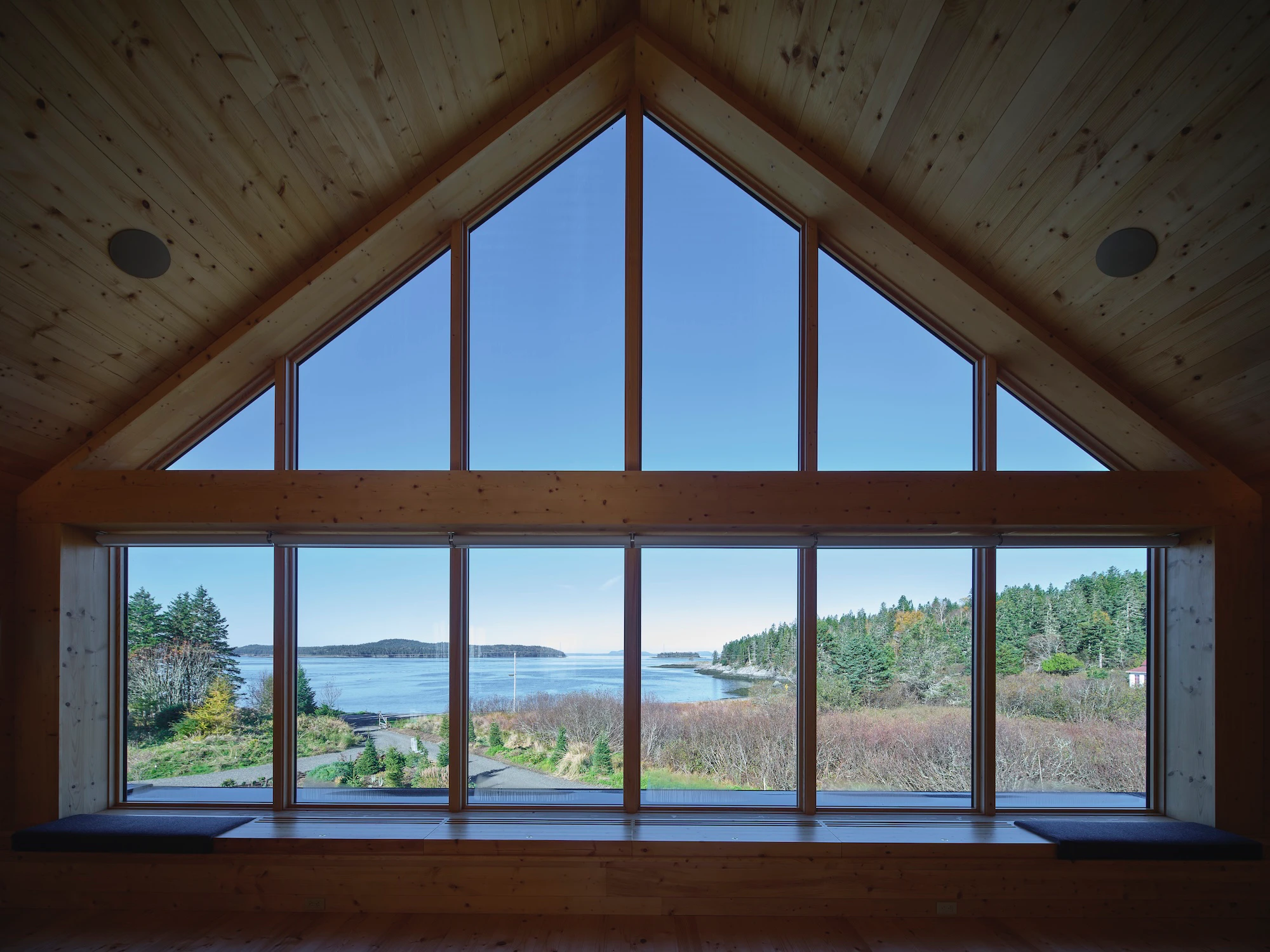 We were proud to supply the Marvin Ultimate windows and doors for the project. That collection is a strong fit here because it pairs the durability of an aluminum-clad exterior with the warmth of wood interiors, which works especially well in a building like this. The large gable glass brings in the long coastal views and gives the upper level its standout moment, while the other openings keep the interior bright without losing the quiet, grounded feel of the architecture.