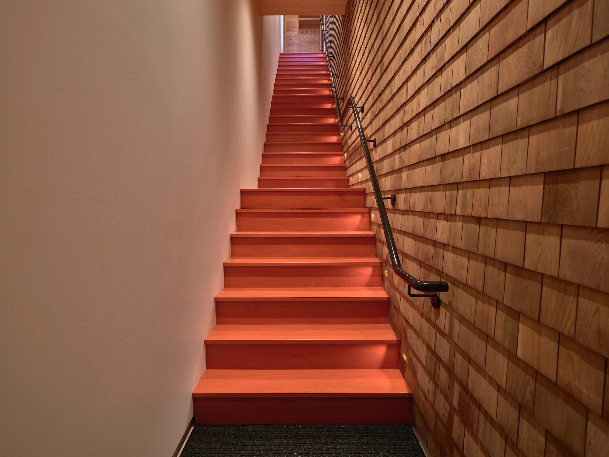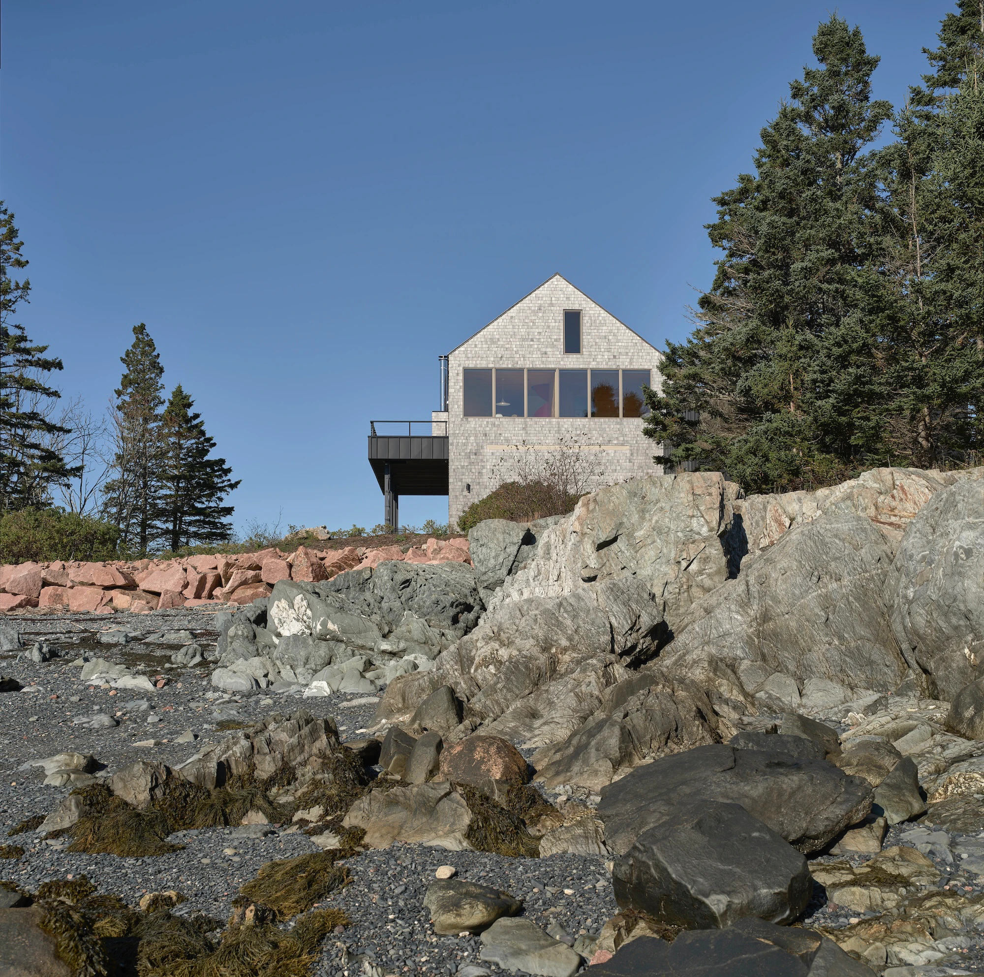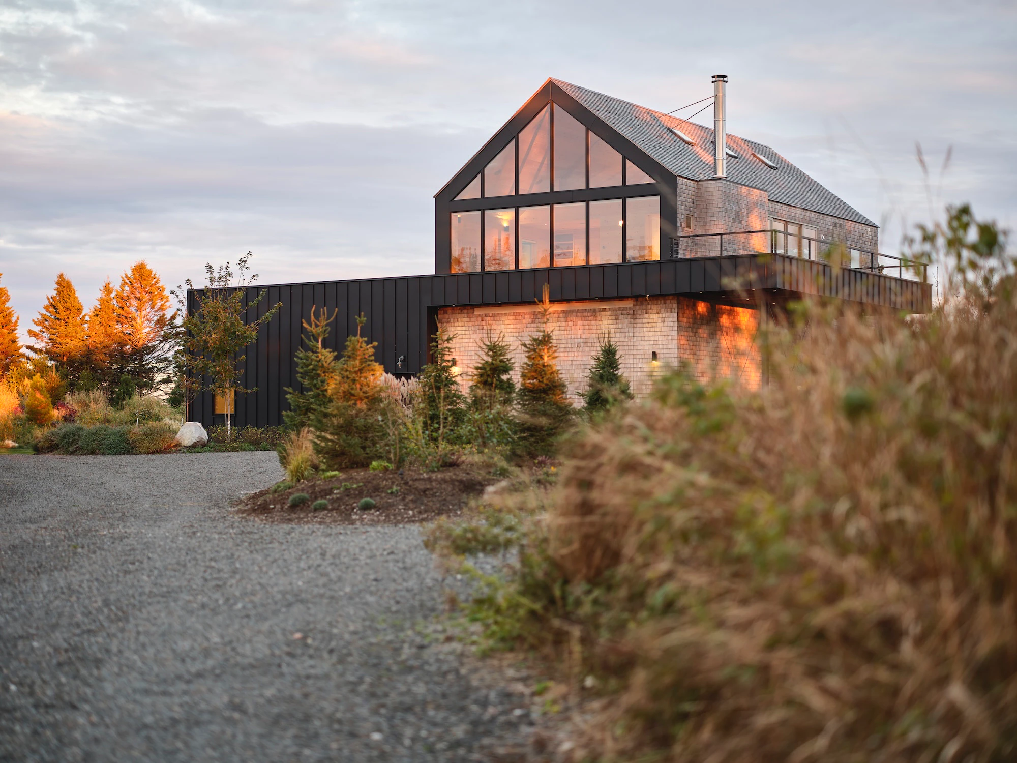 We were proud to supply the Marvin Ultimate windows and doors for the project. That collection is a strong fit here because it pairs the durability of an aluminum-clad exterior with the warmth of wood interiors, which works especially well in a building like this. The large gable glass brings in the long coastal views and gives the upper level its standout moment, while the other openings keep the interior bright without losing the quiet, grounded feel of the architecture.