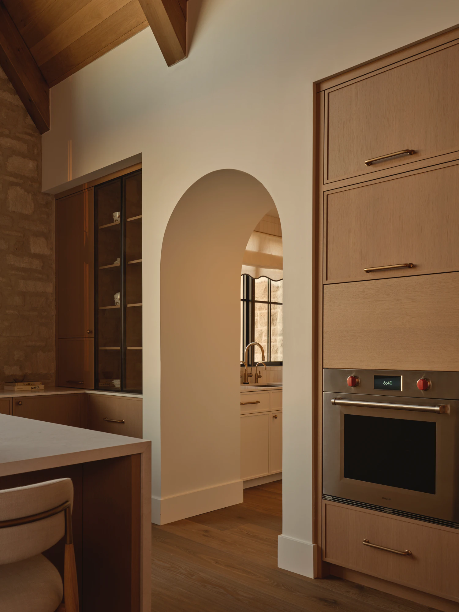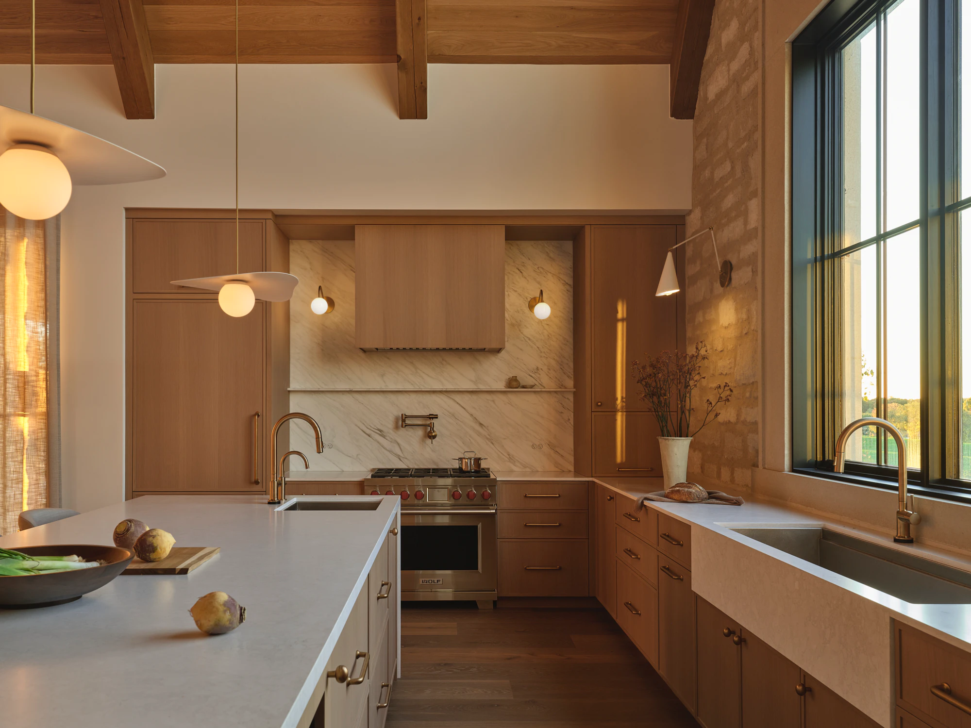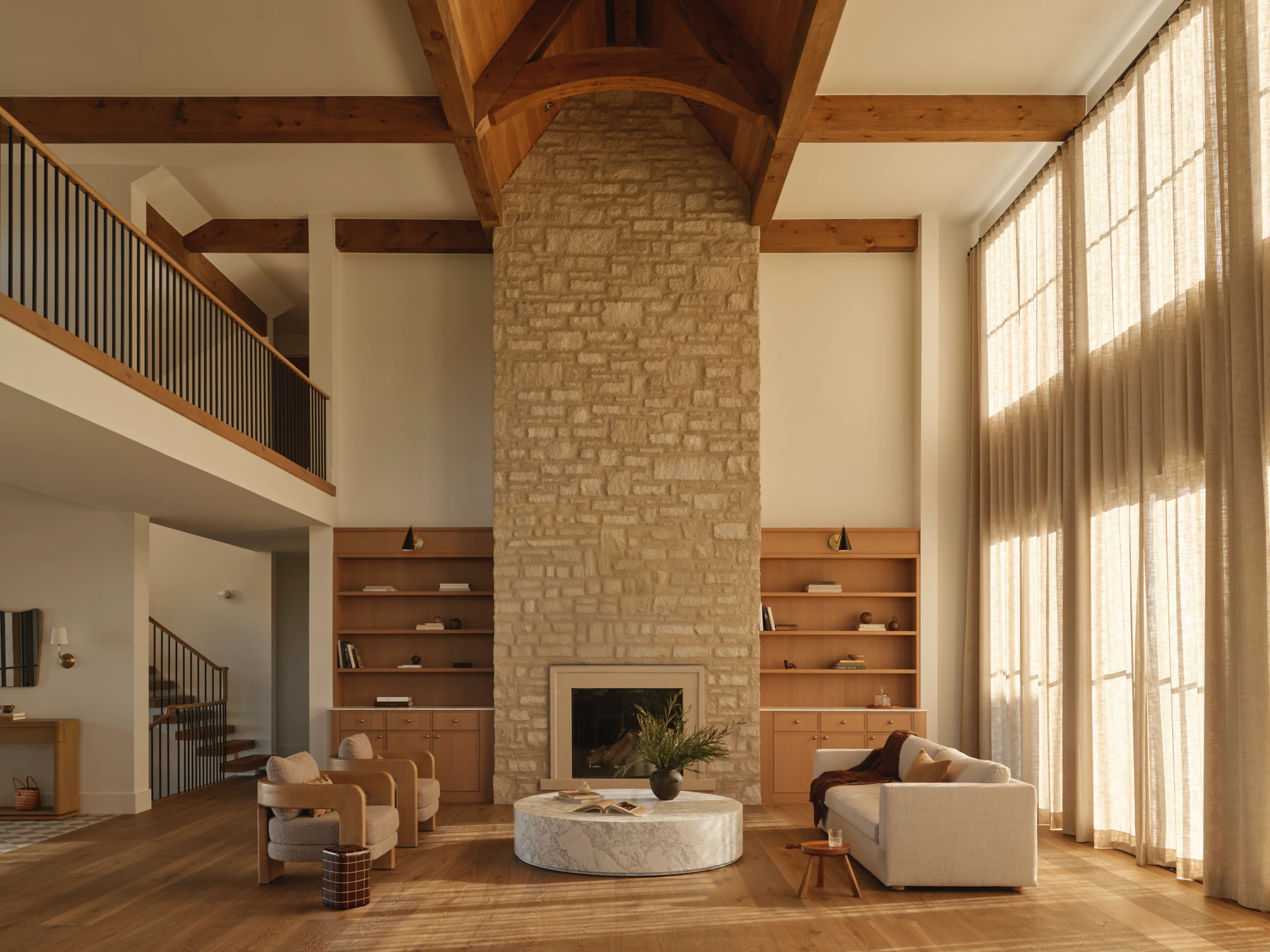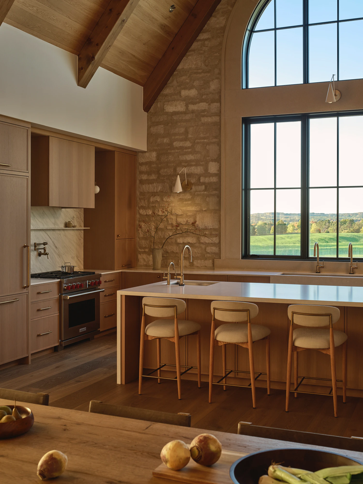 Soaring timber-framed ceilings, arched Marvin windows framing pastoral views, and a palette of natural stone, wood, and linen give the home a quiet grandeur that never feels formal.