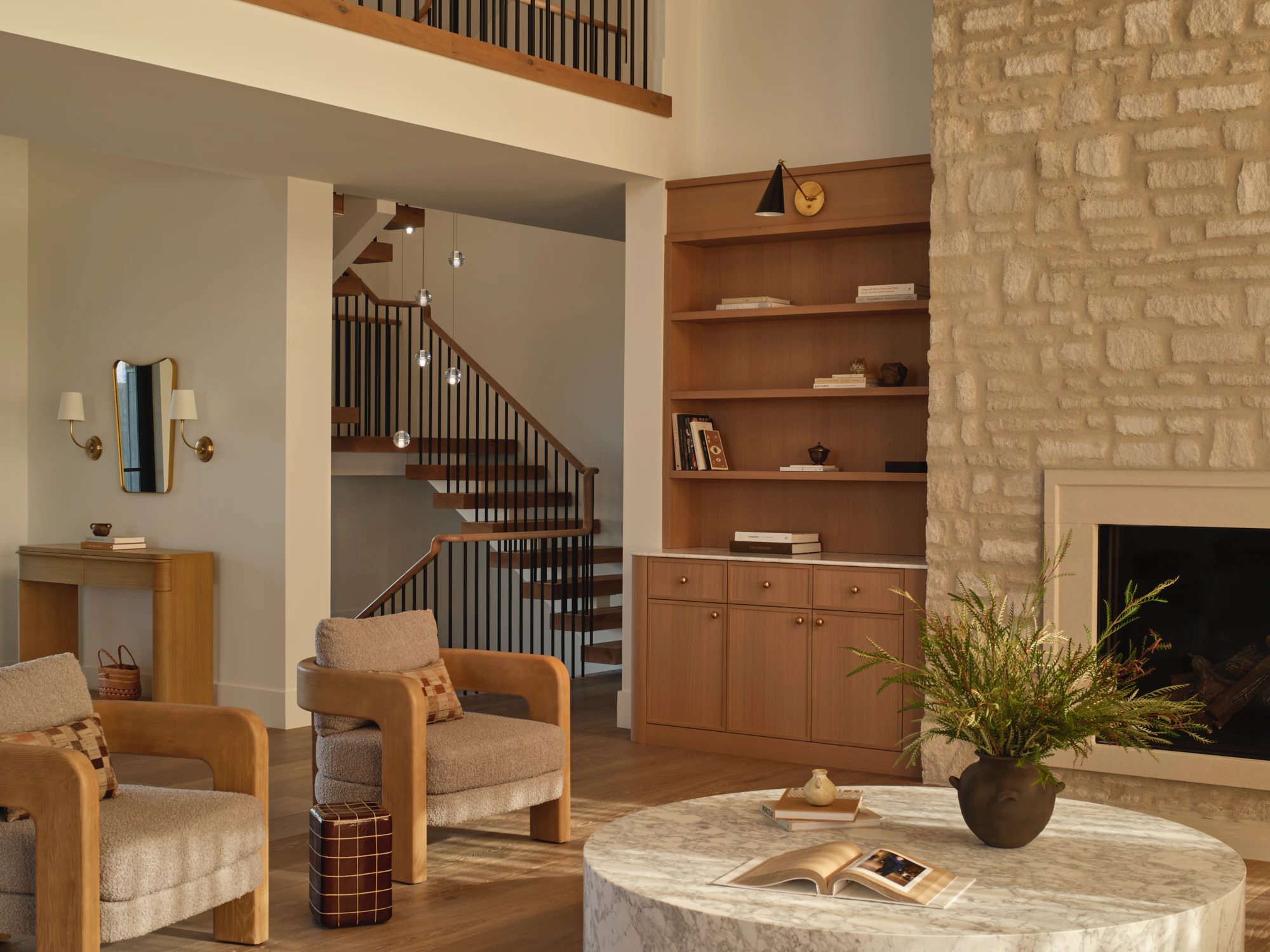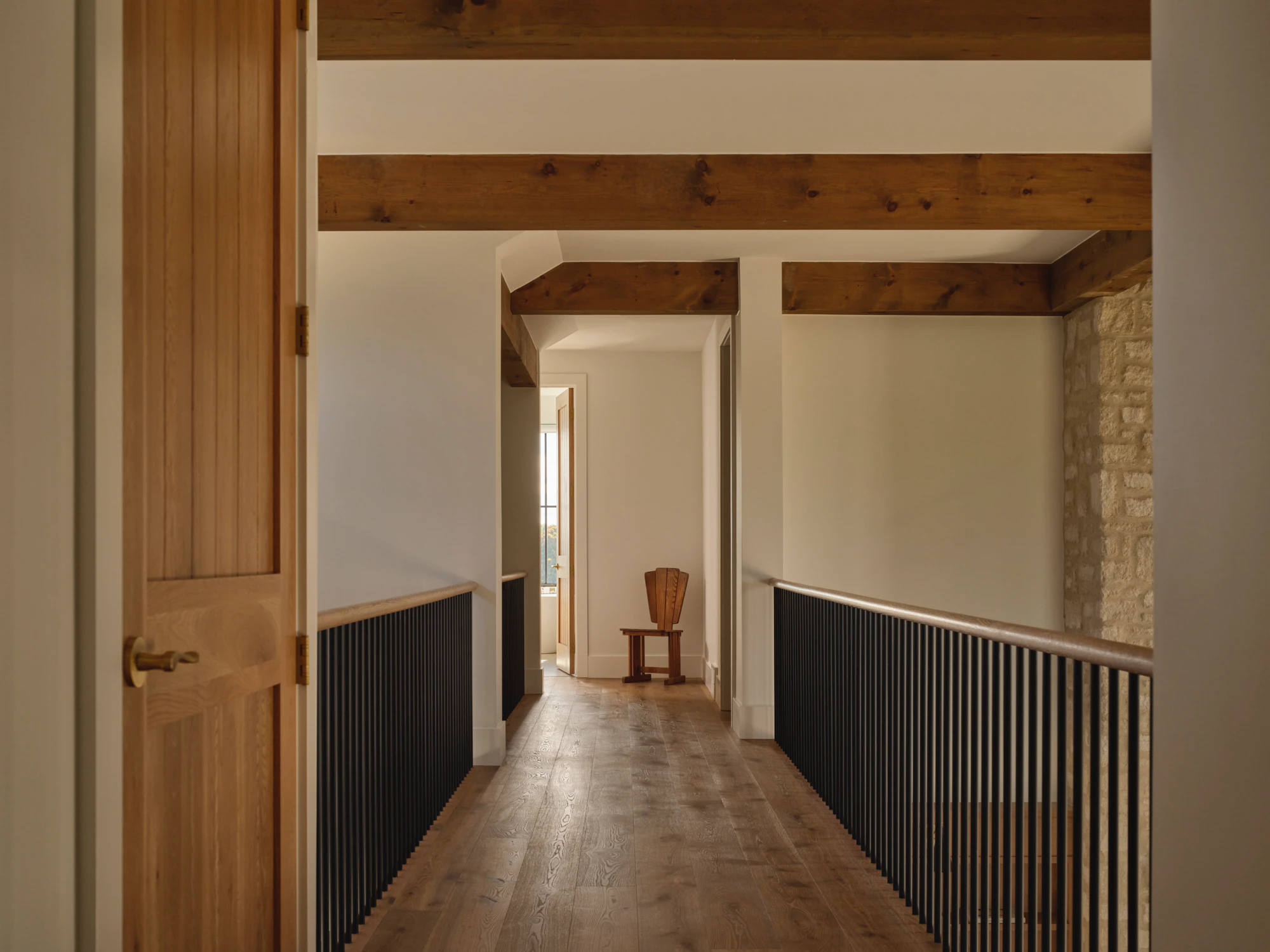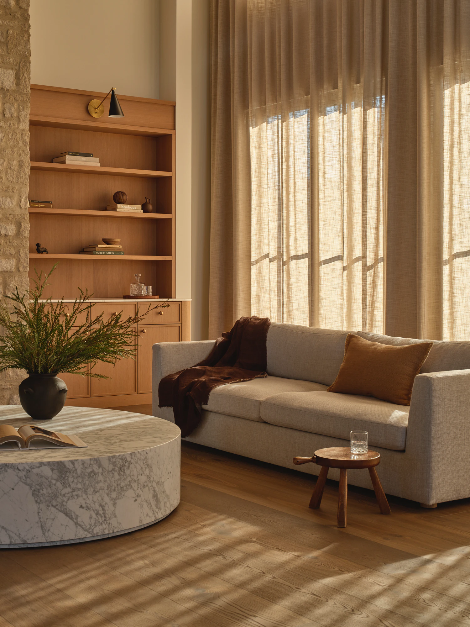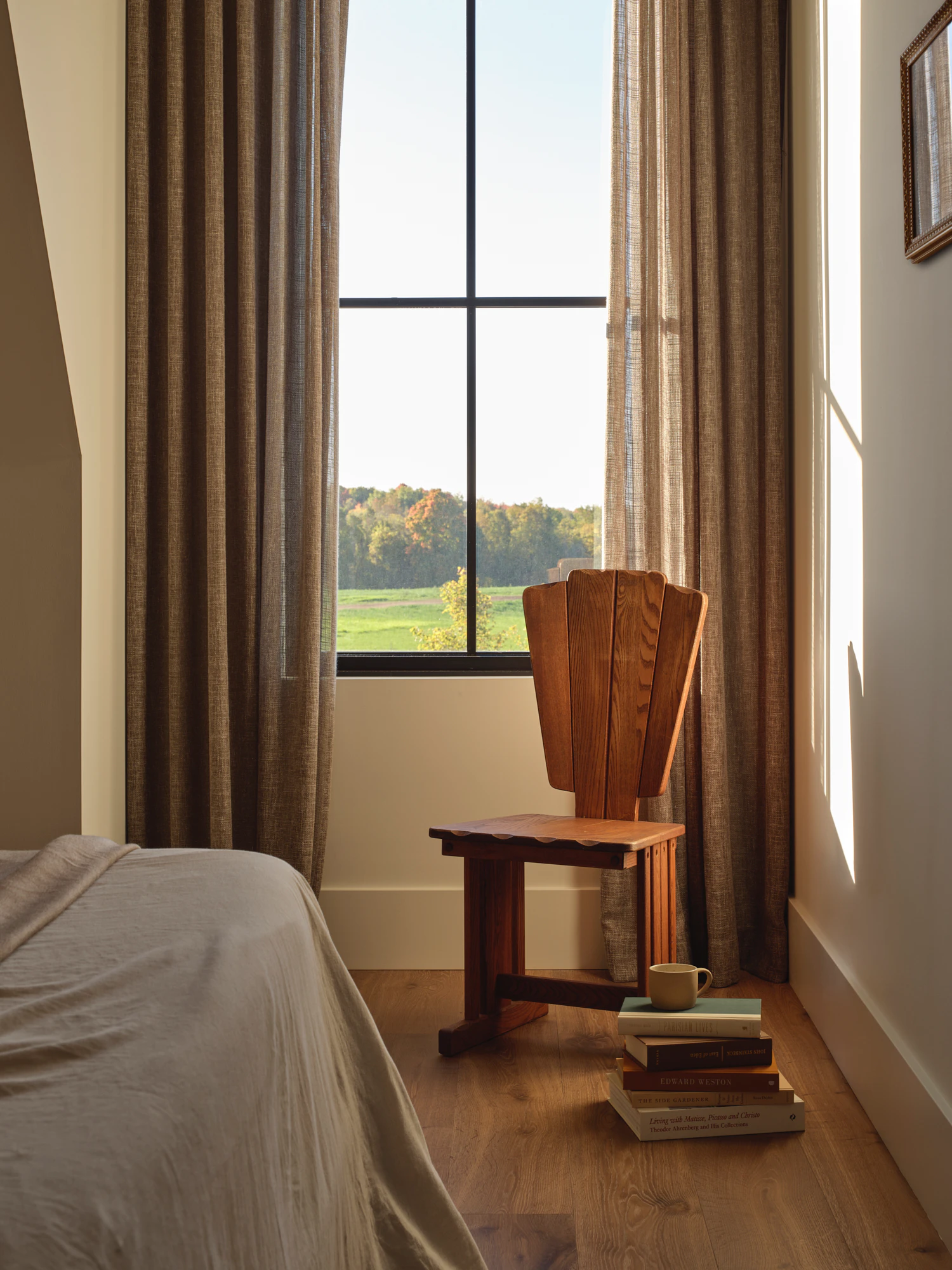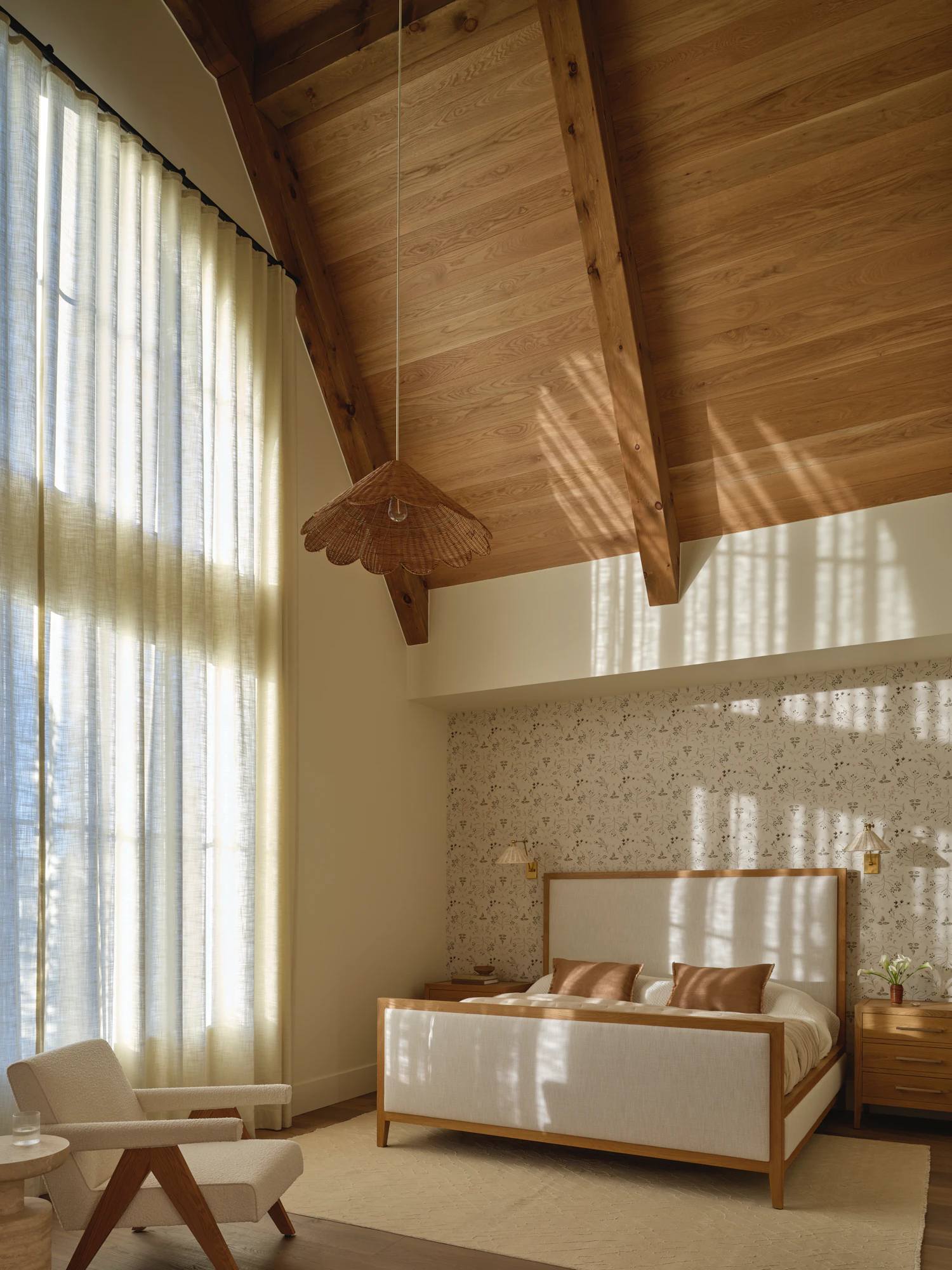 Soaring timber-framed ceilings, arched Marvin windows framing pastoral views, and a palette of natural stone, wood, and linen give the home a quiet grandeur that never feels formal.