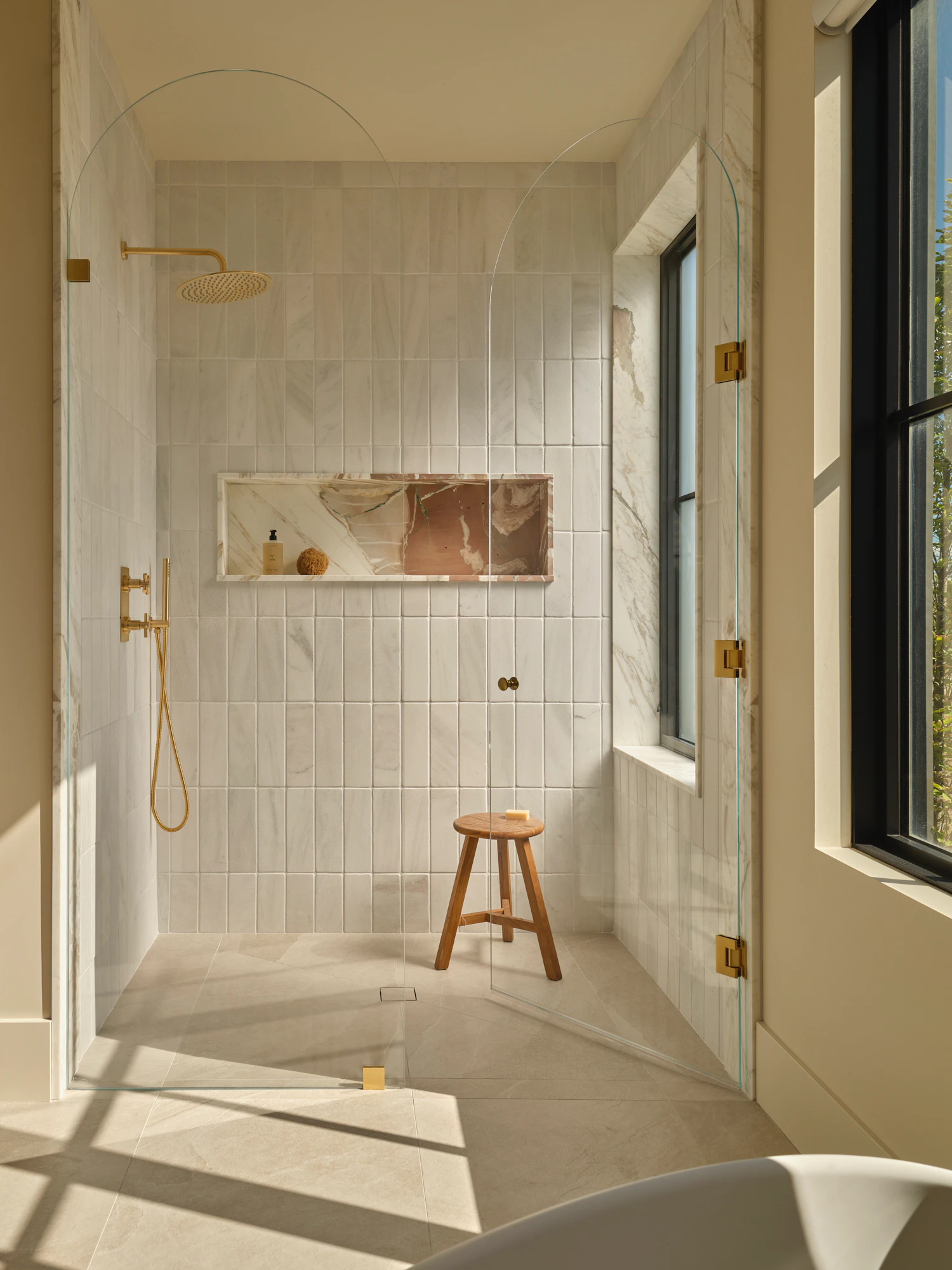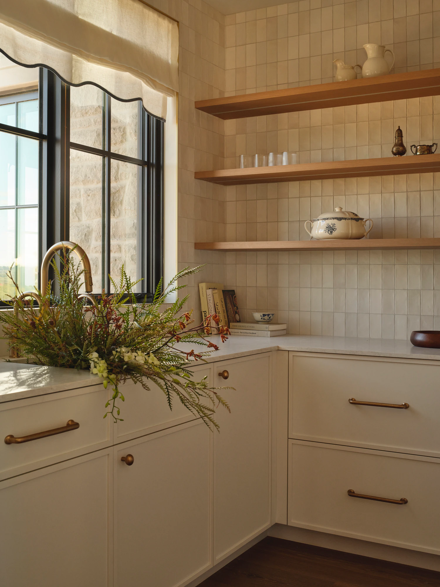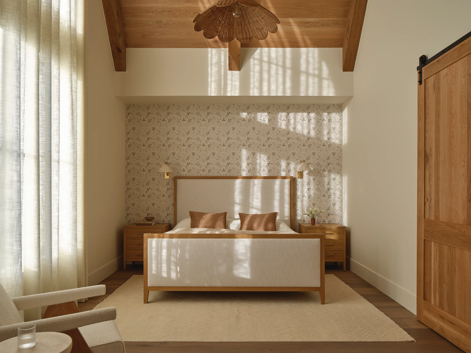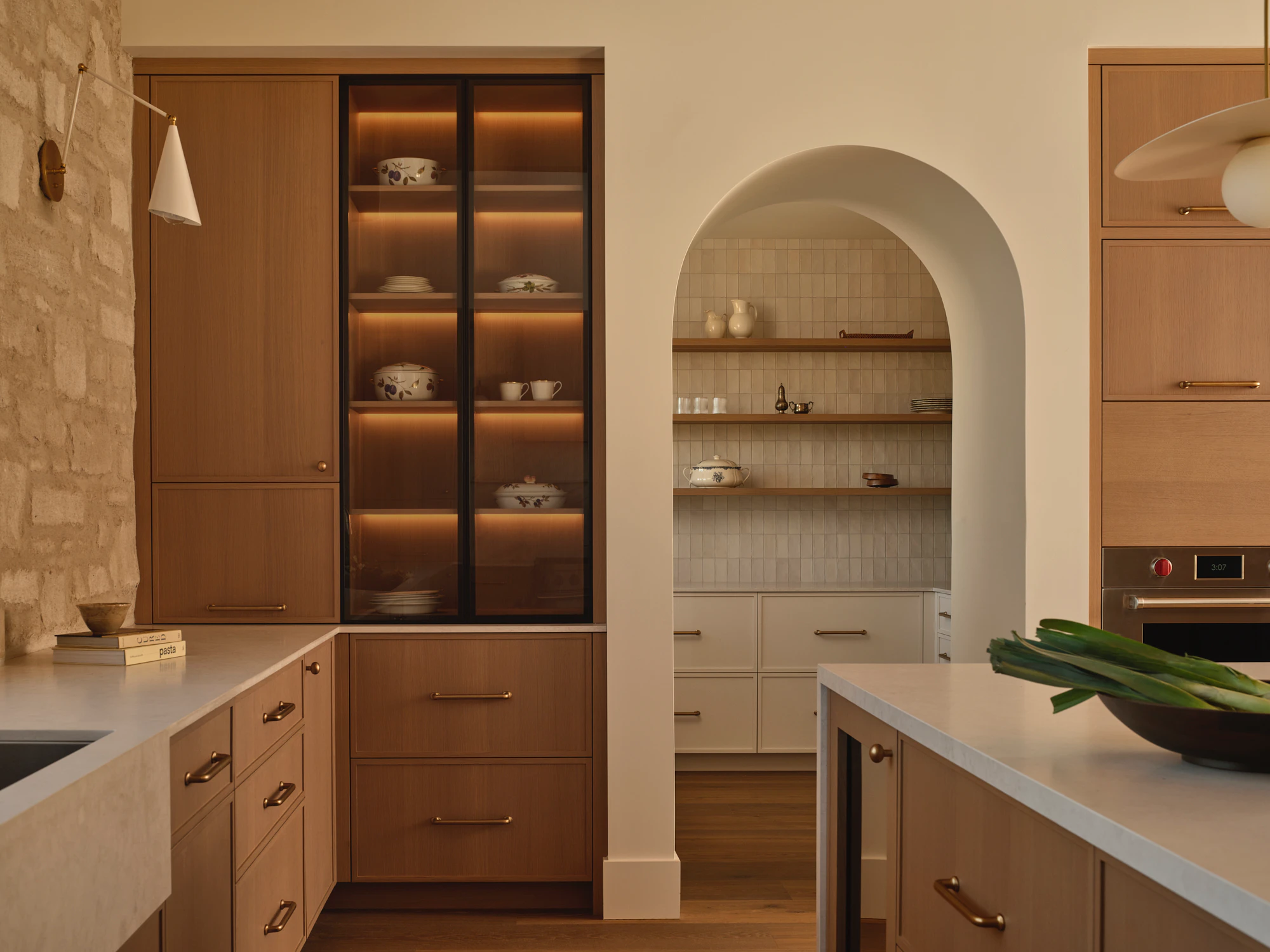 Soaring timber-framed ceilings, arched Marvin windows framing pastoral views, and a palette of natural stone, wood, and linen give the home a quiet grandeur that never feels formal.