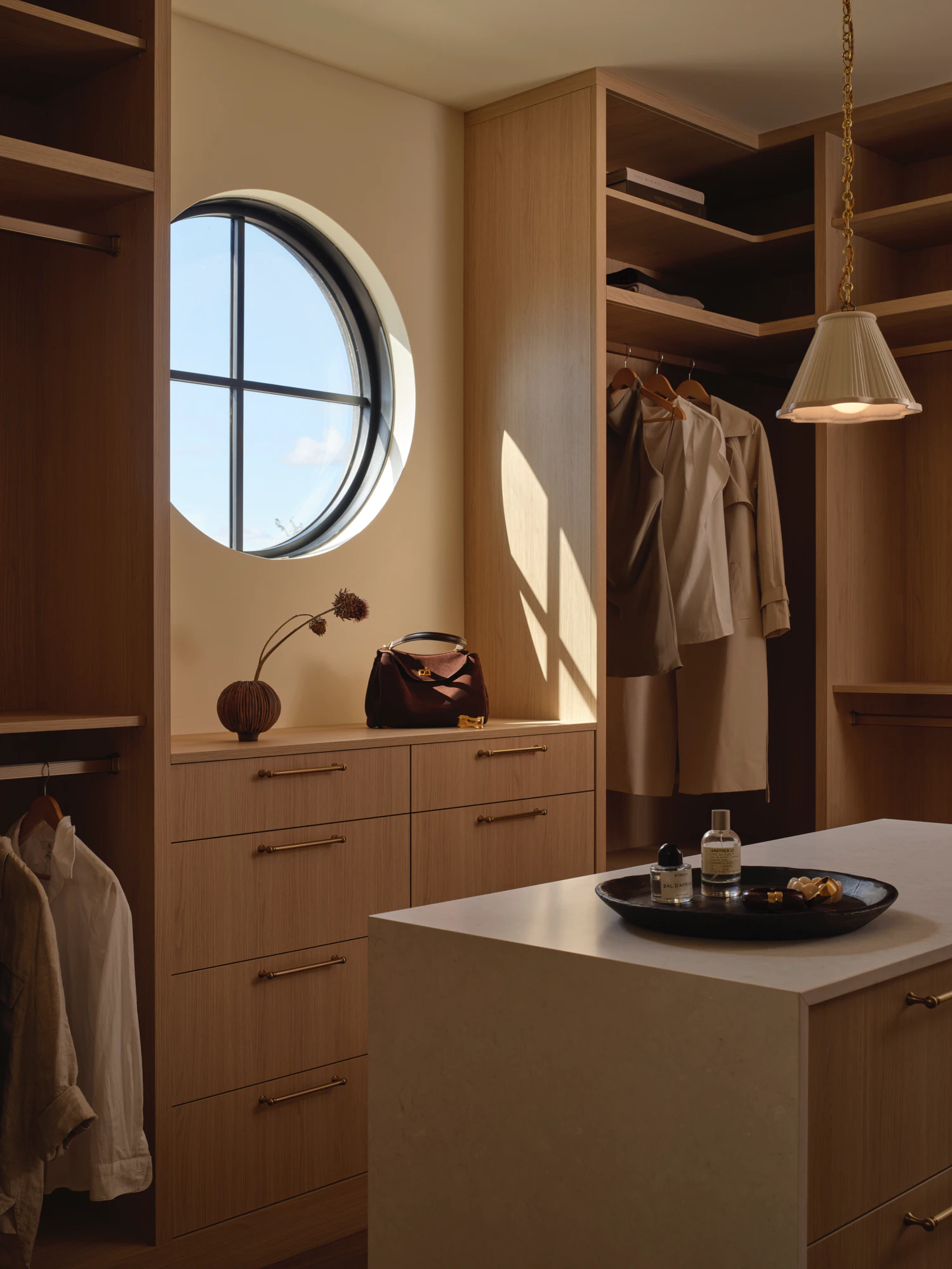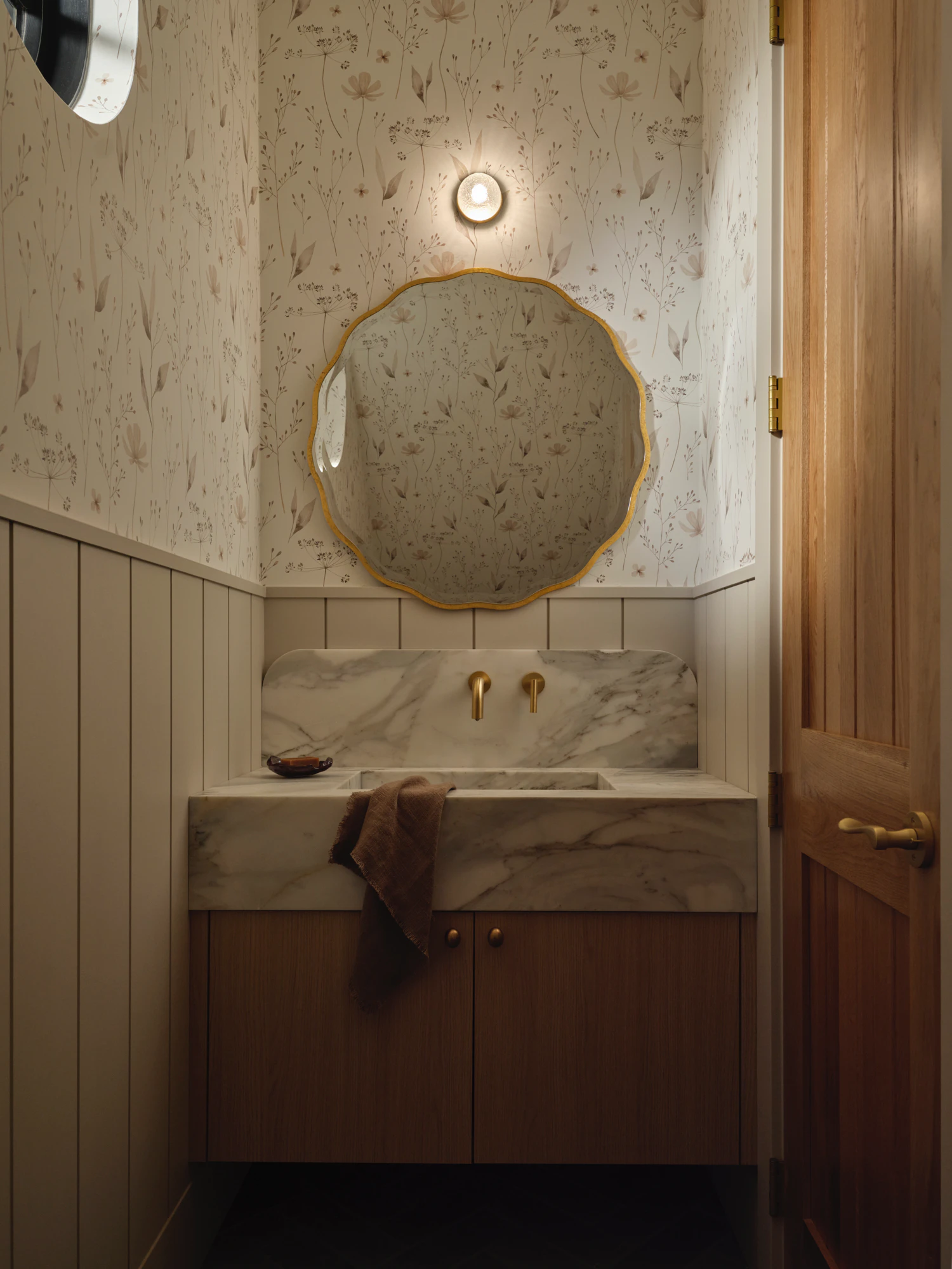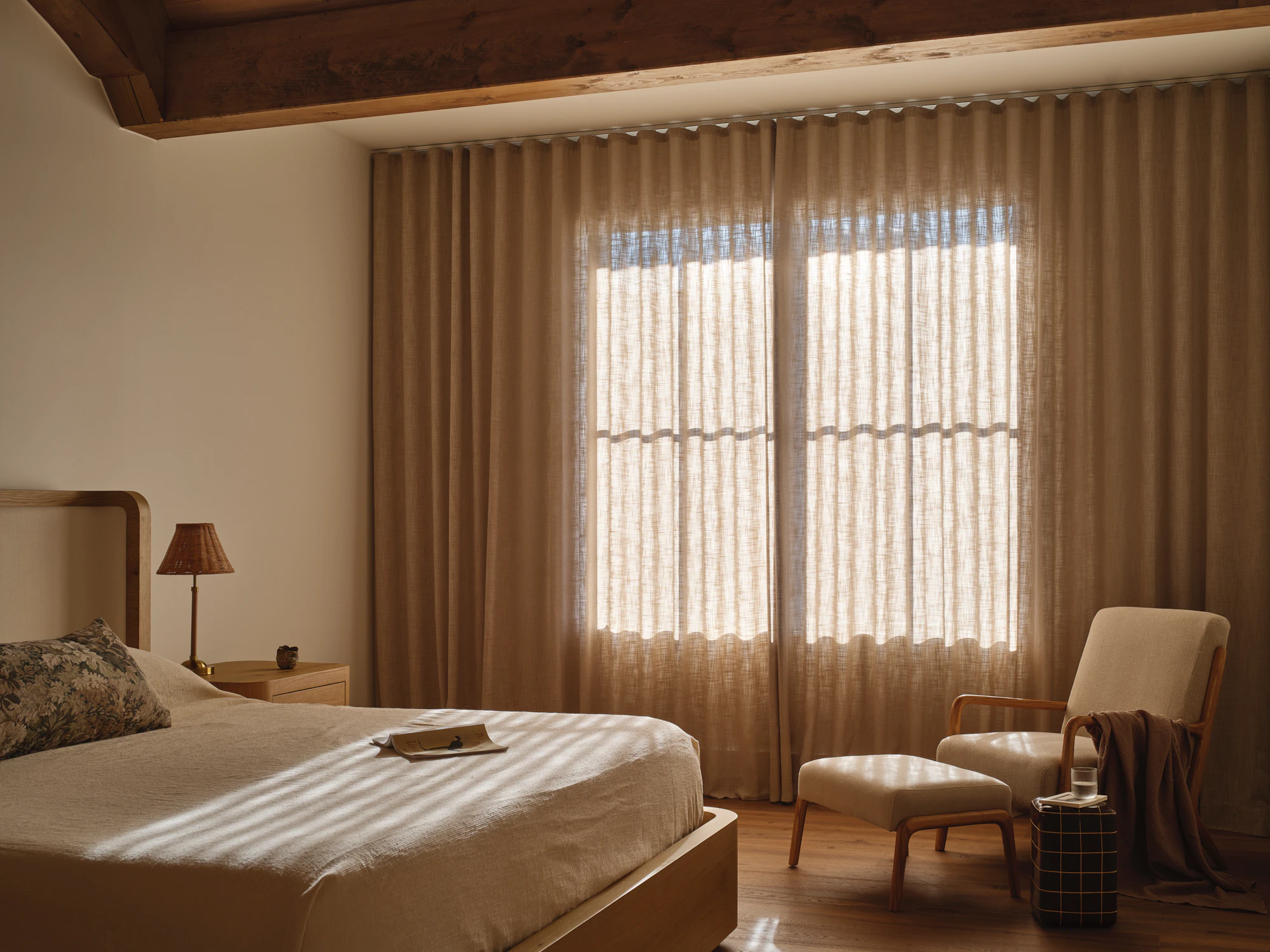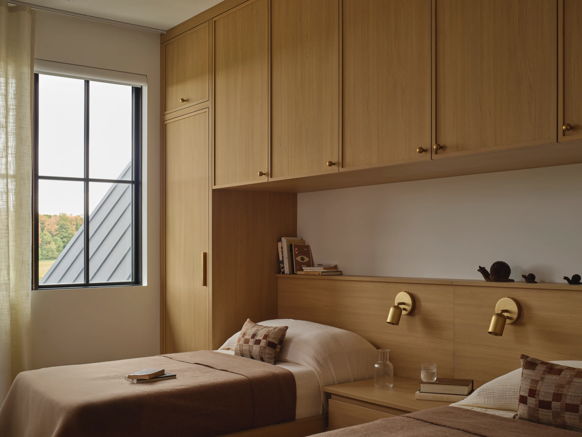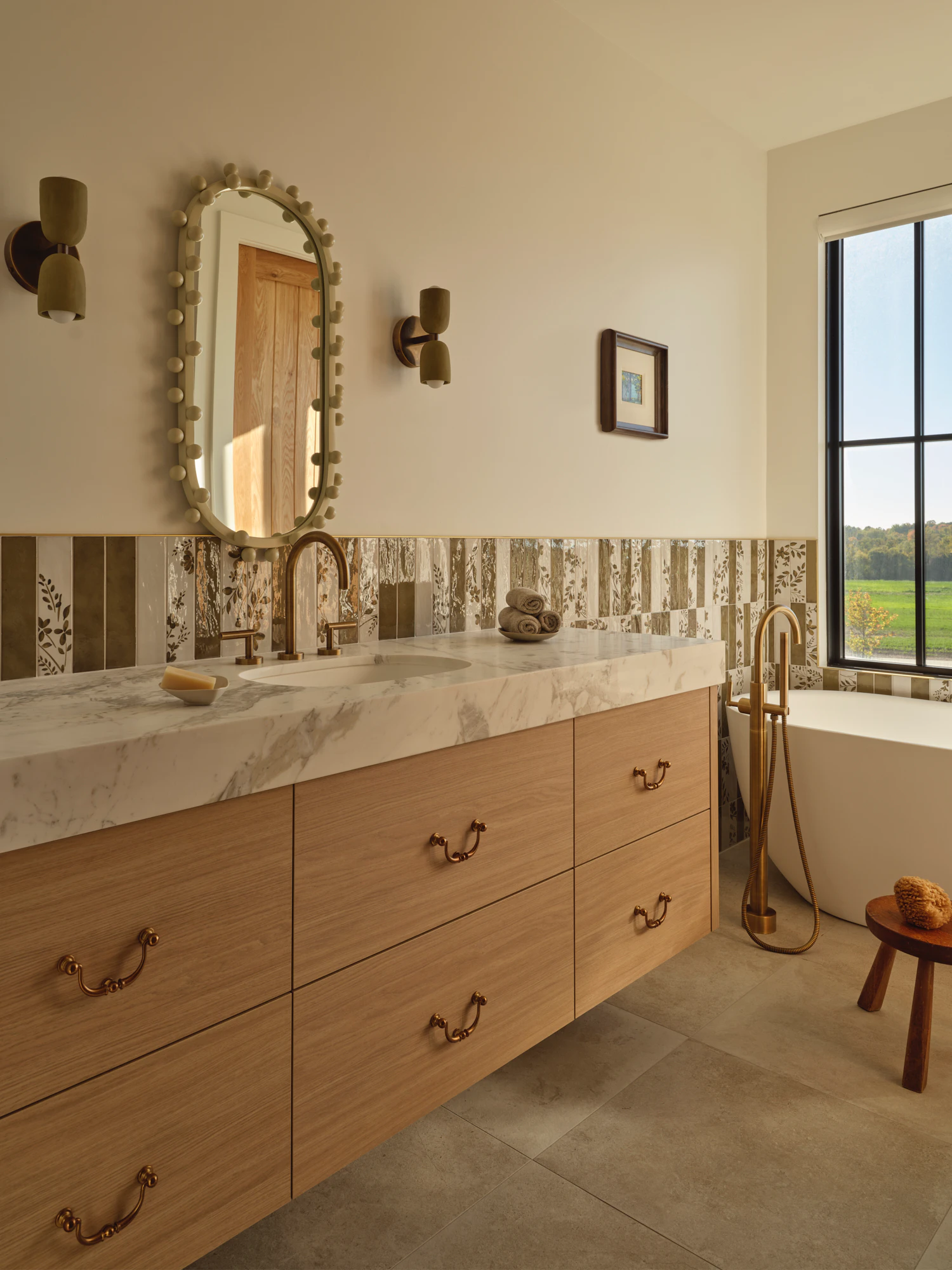 Soaring timber-framed ceilings, arched Marvin windows framing pastoral views, and a palette of natural stone, wood, and linen give the home a quiet grandeur that never feels formal.
