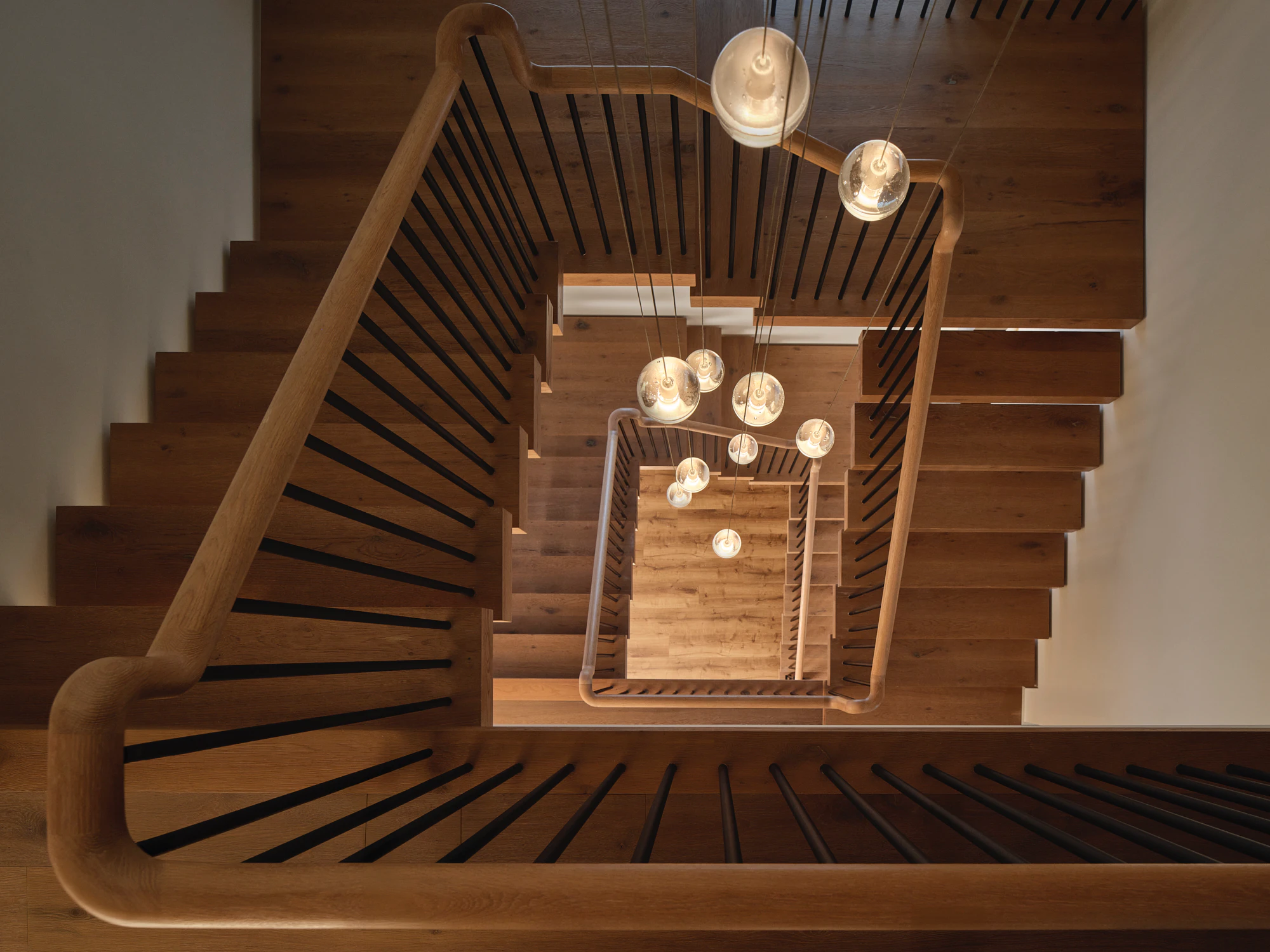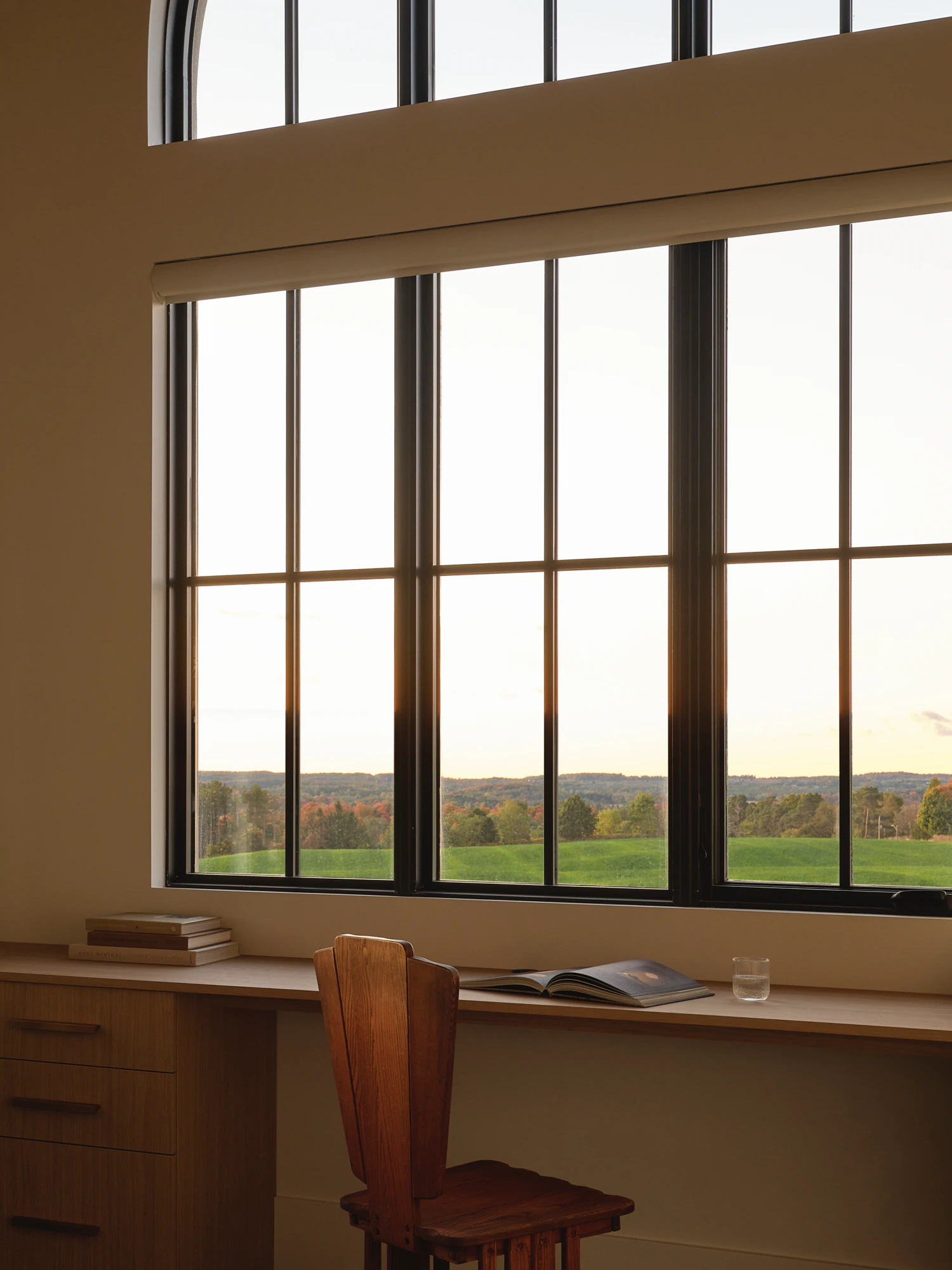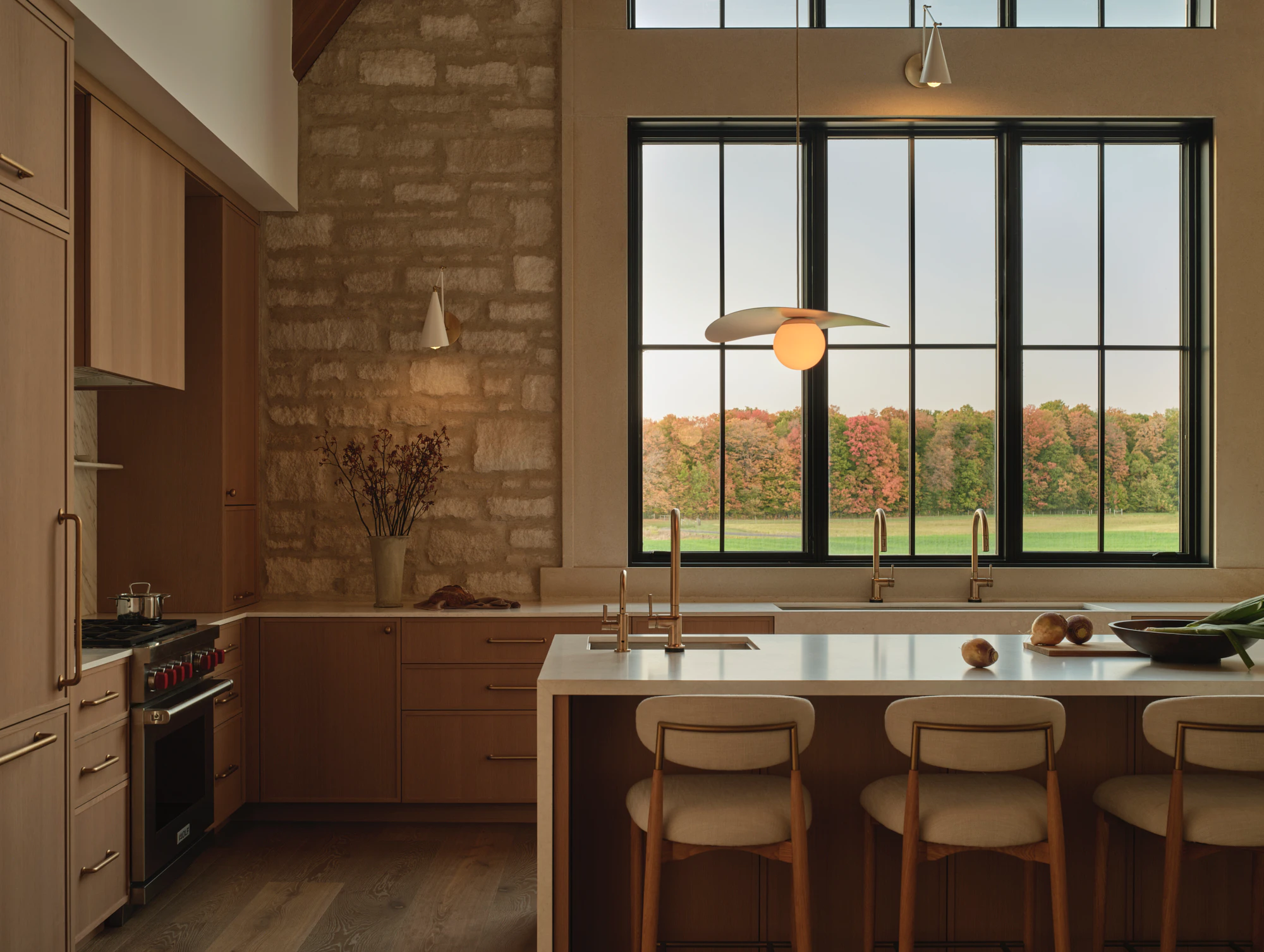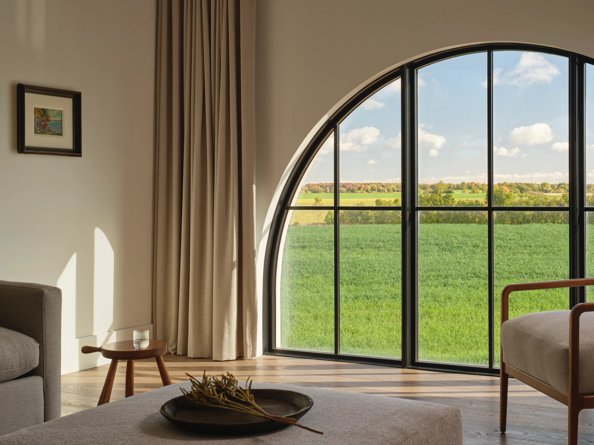 Marvin windows, supplied by our Mississauga location, play a defining role throughout; most strikingly in the dramatic arched assemblies that punctuate the kitchen and main living spaces, framing unobstructed views across the surrounding farmland.